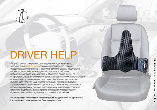 Разработанная специально для водителей всех категорий, автомобильная накладкаKULIK-SYSTEM DriverHelp SOLO формирует правильную осанку, предотвращает появление и развитие остеохондроза, радикулита, сколиоза, межрёберных невралгий. Накладка заботливо поддерживает поясничный отдел и оберегает позвоночник от микротравм, вызванных механическими воздействиями. Используемая только в продукции компании система поможет избежать водителям дискомфорта в поездках и предотвратит болевые синдромы от длительного стояния в «пробках». Не оказывает негативных механических воздействий на организм! Не содержит электрических биостимуляторов! Эргономичный корректор осанки на автомобильное кресло. Уникальное изобретение, разработанное специально для водителей и пассажиров автотранспорта. Комфортно повторяя анатомические изгибы тела, снижает нагрузку на поясничный отдел, стабилизирует грудной отдел позвоночника и корректирует осанку без самоконтроля.